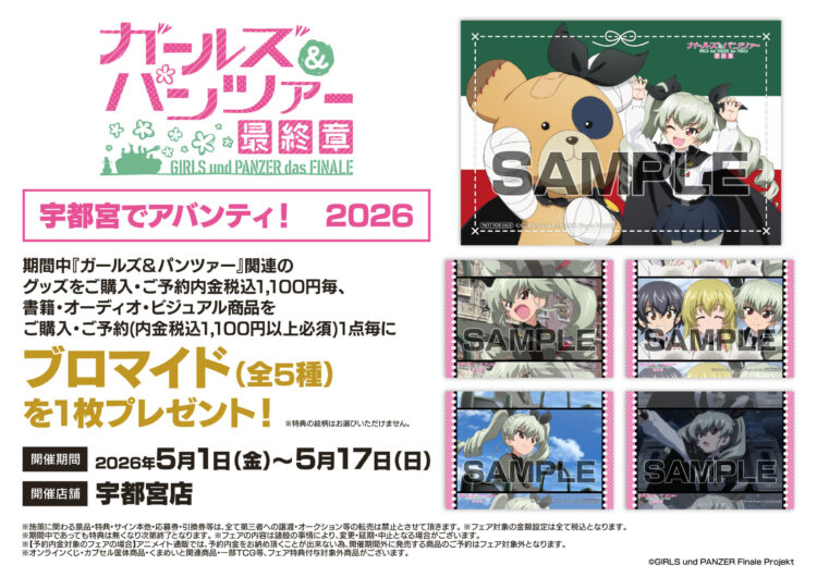 期間中『ガールズ&パンツァー』関連のグッズをご購入・ご予約内金1,100円(税込)毎、書籍・オーディオ・ビジュアル商品をご購入・ご予約(内金1,100円(税込)以上必須)1点毎にブロマイド(全5種)を1枚プレゼント!