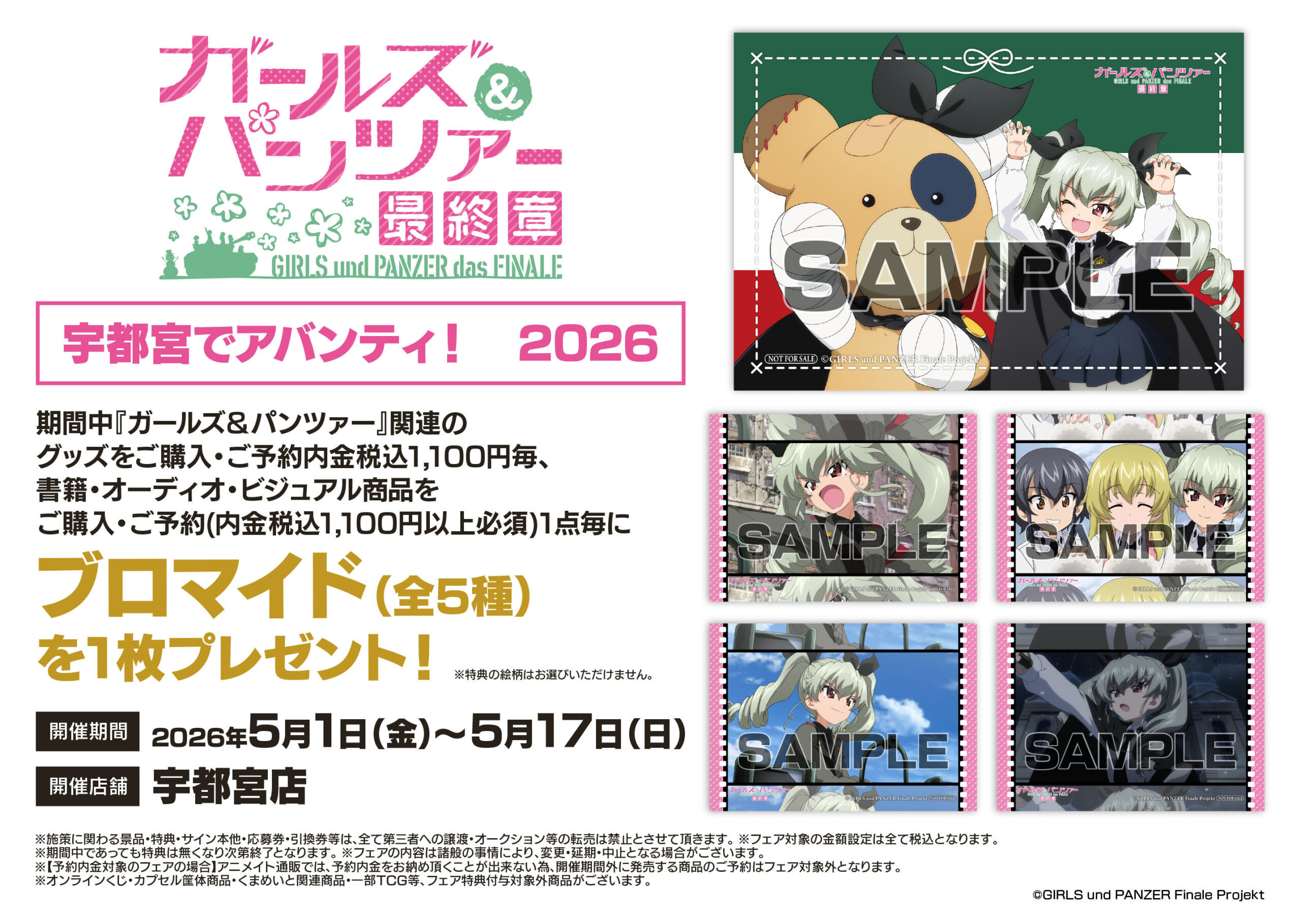 期間中『ガールズ&パンツァー』関連のグッズをご購入・ご予約内金1,100円(税込)毎、書籍・オーディオ・ビジュアル商品をご購入・ご予約(内金1,100円(税込)以上必須)1点毎にブロマイド(全5種)を1枚プレゼント!
